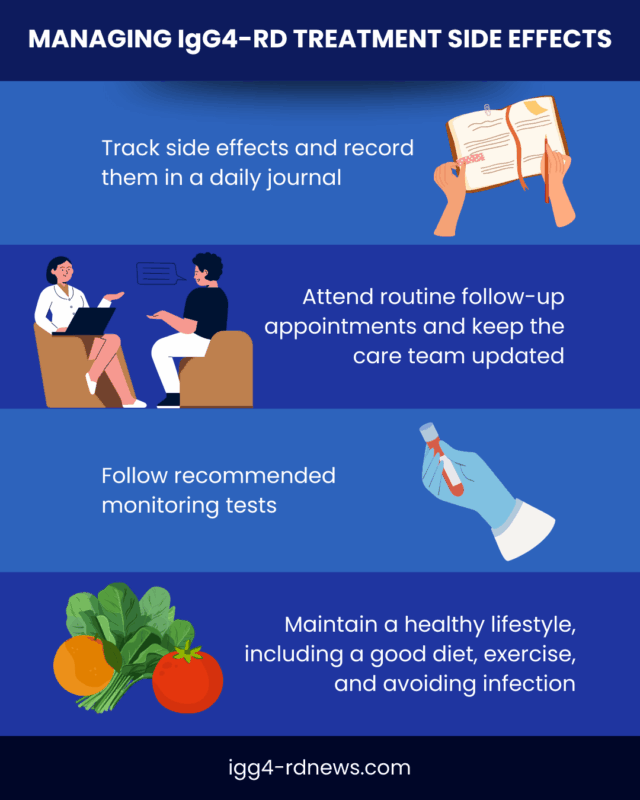 Appropriately managing IgG4-RD treatment side effects relies on prompt and thorough communication, so patients should be sure to maintain a regular follow-up schedule with their healthcare providers. It’s also a good idea to keep a side effect diary to make it easier to update the care team as issues arise.